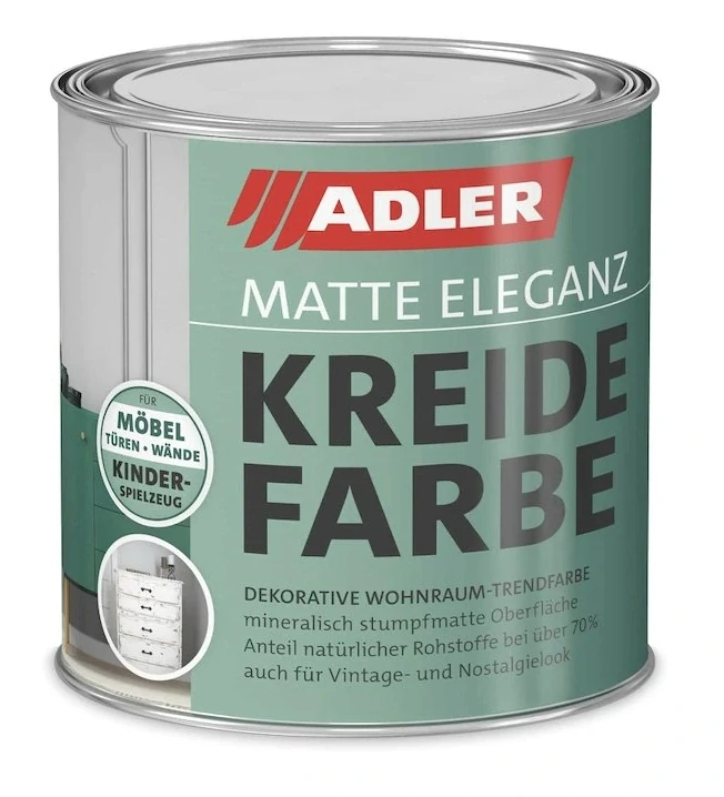 Adler Kreidefarbe je vysoce kvalitní křídová barva, ideální pro renovaci nábytku, interiérových doplňků a dekoračních projektů. Díky své sametově matné povrchové úpravě a výborné přilnavosti poskytuje skvělý základ pro rustikální a vintage vzhled. Barva je ekologická, na vodní bázi a téměř bez zápachu, což ji činí vhodnou pro použití v interiérech.
