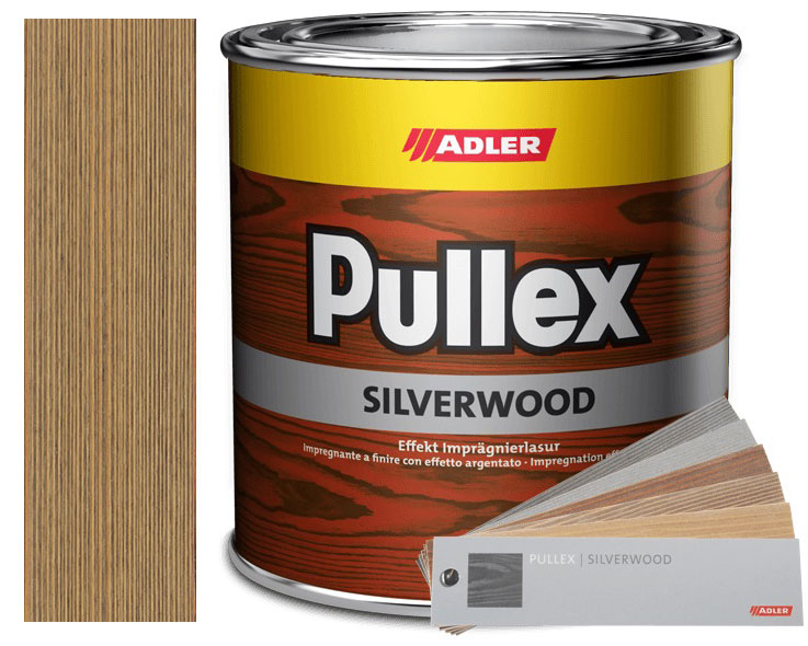 Adler Pullex Silverwood je efektní impregnační lazura na bázi rozpouštědel s obsahem biocidních látek. Poskytuje přirozený efekt s otevřenými póry. Určená na dřevo v exteriéru.  Inovativní odstíny s metalickým efektem (resp efektem starého zešedlého dřeva). Speciálně pigmentovaná lazura dodává ošetřenému dřevu patinu, kterou jinak dosahuje dlouhodobým působením povětrnostních vlivů. Tím se můžete vyhnout i neestetickému nerovnoměrnému zvětrávání např. dřevěných obkladů. Jako rozpouštědlo jsou použity bezaromatické benzíny, díky nimž je téměř bez zápachu.