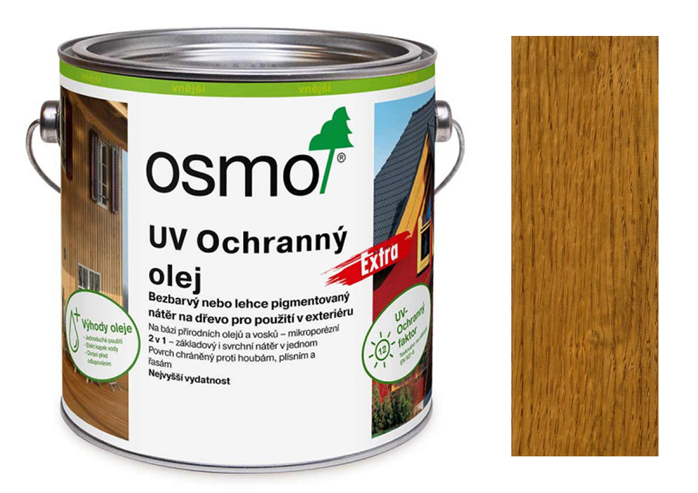 Transparentní, lehce pigmentovaný, polomatný nátěr, k použití venku. Je vhodný zejména na všechny svislé dřevěné plochy ve vnějších prostorách: dřevěné fasády, střešní podhledy, dveře, okna, balkonová prkna atd. Jako konečný nátěr na již předem barevně upravené dřevo prodlužuje výrazně Osmo UV-Ochranný olej barevný interval renovace. Jako samostatný nátěr zamezuje procesu šednutí ochranným faktorem UV12 v porovnání s neošetřeným dřevem.