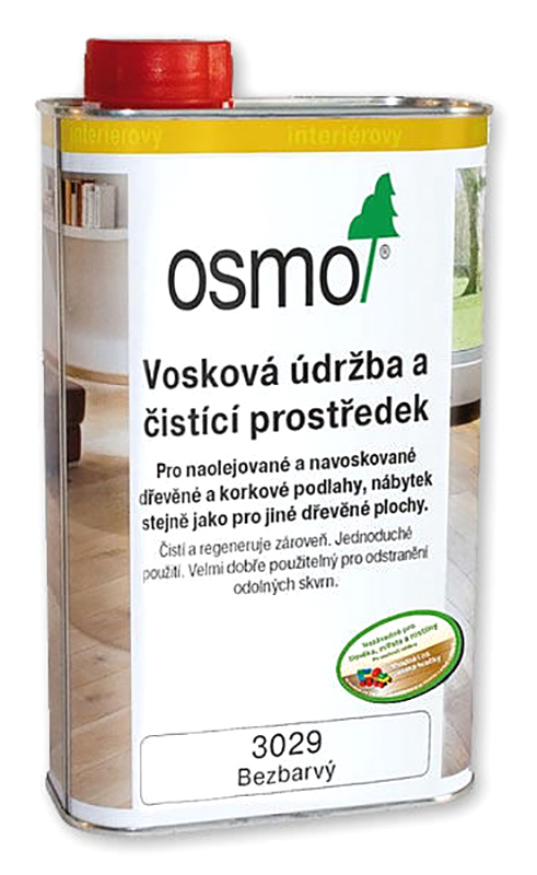 Bezbarvá nebo bíle transparentní, na podlahy a nábytek. Osmo Vosková údržba a čistící prostředek čistí a regeneruje zároveň; zásobuje dřevo přírodními tvrdými vosky.